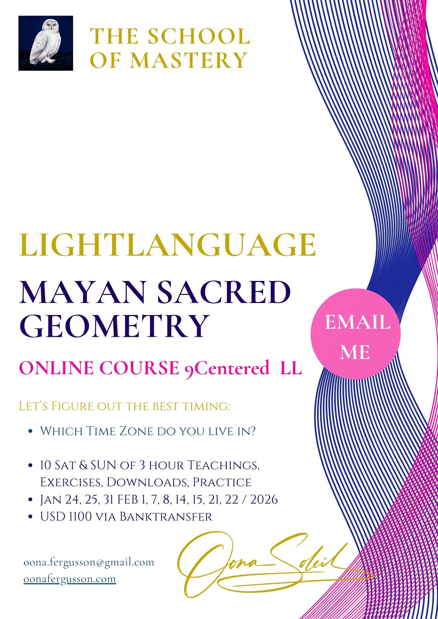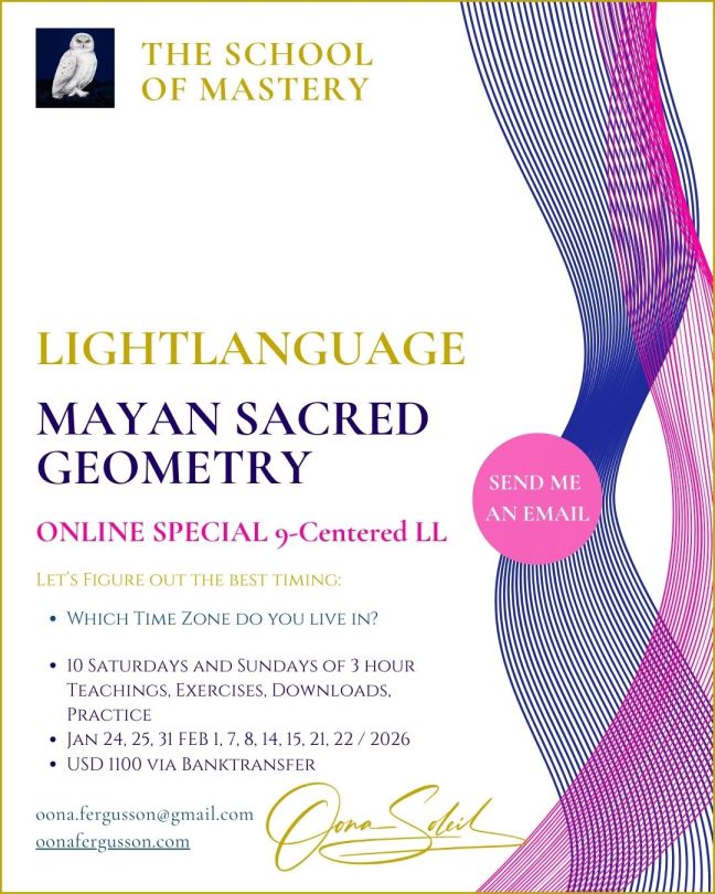 On her journeys Oona has had close proximity contact with ETs, been given the ‘Codes of the Universe’ through a crystal placed in Aotearoa by ETs from Sirius, has activated her Chakras at specific pyramids in the Yucatan jungle, and received the ‘Keys of Dimensional Mastery’ from a Mayan Curandera-Shaman.