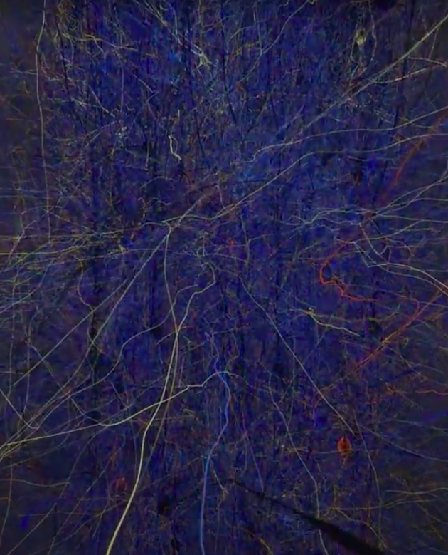 Computer-generated model of neurones in 2 cubic mm of brain tissue – a work of Art, imagine it alive and sparkling, enlightened: